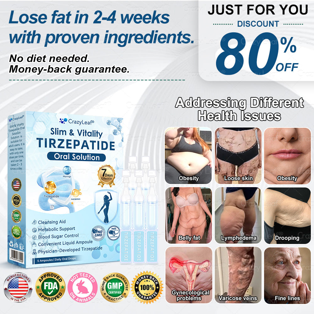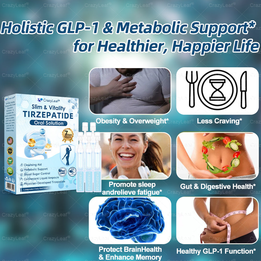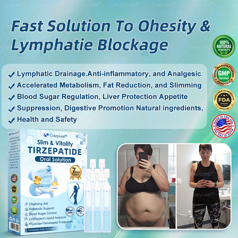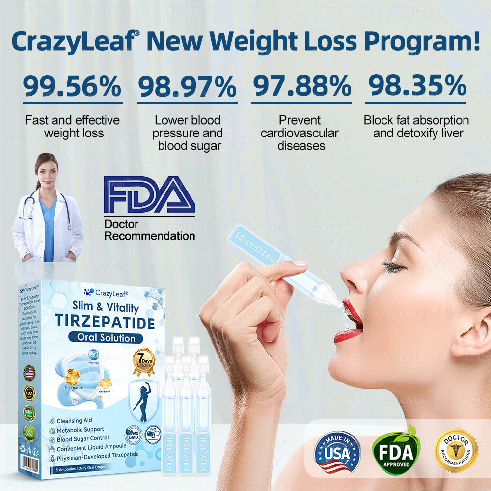 CrazyLeaf® Slim and Vitality Tirzepatide Oral Solution This cutting-edge product was designed by a team of leading experts in obesity management who have conducted years of in-depth research to fully understand the mechanisms of weight loss and obesity control. Combining Teicoplanin with potent herbal ingredients boosts metabolism, accelerates fat burning, and aids in digestive and lymphatic health. FDA-approved for safety and efficacy, this Oral Liquid offers a science-backed solution for weight loss and overall well-being.